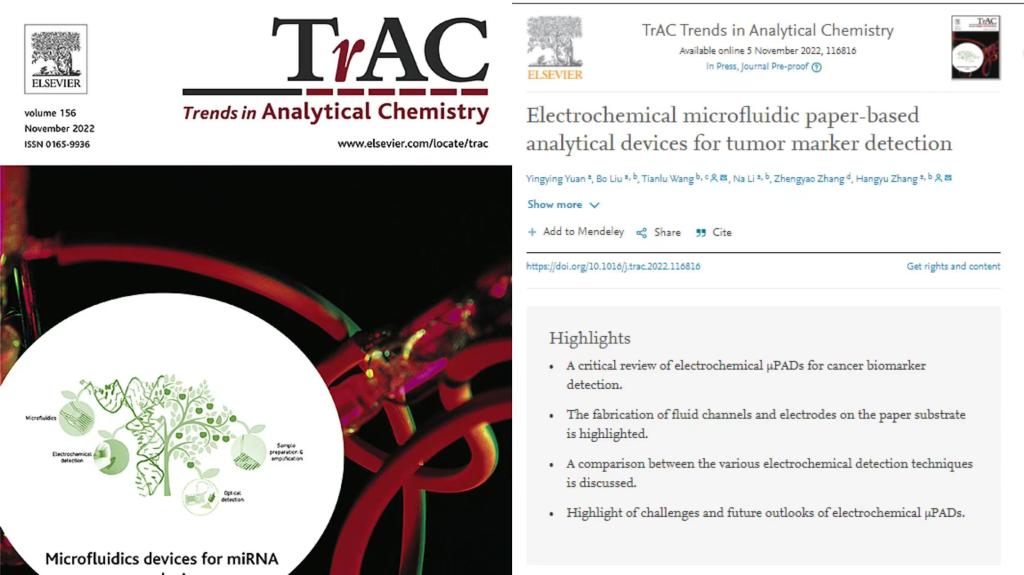 Recently, a paper titled "Electrochemical microfluidic paper-based analytical devices for tumor marker detection" co-authored by Associate Professor Zhang Hang and Professor Liu Bo from the School of Biomedical Engineering, Faculty of Medicine at Dalian University of Technology was published in the top-ranked journal in the field of analytical chemistry,Trends in Analytical Chemistry. This journal is the most authoritative review journal in the field of analytical chemistry with an impact factor of 14.9 this year, ranking first in its domain. Yuan Yingying, a graduate student(enrolling in2022)from the School of Biomedical Engineering, is the first author of the article. Associate Professor Zhang Hang from the School of Biomedical Engineering and Chief Physician Wang Tianlu from the affiliated cancer hospitalof the universityare the corresponding authors. The School of Biomedical Engineering at Dalian University of Technology is the primary institutioncreditedfor the paper, with the affiliatedtumorhospital being the collaborating institution.