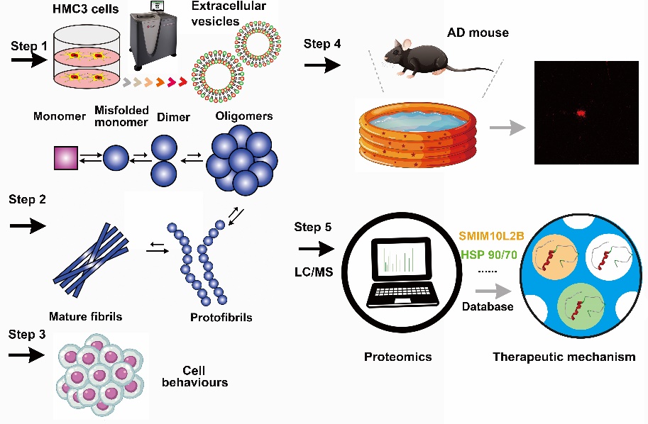 In recent years, extracellular vesicles have garnered attention for their ability to cross the blood-brain barrier and not induce inflammatory reactions. Therapeutic approaches based on these vesicles are emerging. This study investigated vesicles released from human microglial cells to inhibit Aβ peptide aggregation as a treatment for AD. The researchers first isolated vesicles of varying sizes released by human microglial cells, including small extracellular vesicles and microvesicles. It was found that the smaller vesicles did not inhibit Aβ aggregation, while the microvesicles strongly inhibited it. Further research showed that compared to the smaller vesicles, microvesicles reduced Aβ plaques in the brains of AD mice, improving their cognitive abilities and reducing neuroinflammation. This suggested that microvesicles could be a potential drug for treating AD. The study revealed that, compared to smaller vesicles, microvesicles concentrated various inhibitors of Aβ aggregation. Therefore, the findings suggest that these microvesicles act as a platform combining various Aβ inhibitors, which can collaboratively treat AD, thus offering a new perspective for AD treatment.