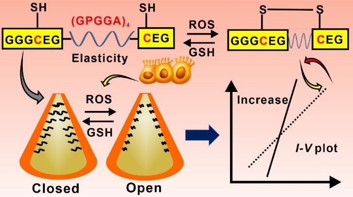 Inspired by the elasticity of spider silk proteins, this study designed a ROS-responsive peptide GGGCEG(GPGGA)4CEG (hereafter referred to as Elastic Peptide ES Peptide). When this peptide is modified onto conical nanopores, it forms a blocking current. Because the (GPGGA)4 in the ES peptide has two cysteines on either side that can be oxidized to form intramolecular disulfide bonds (-S-S-), it causes structural changes in the ES peptide. This, in turn, results in changes in the nanopore diameter and eventually leads to variations in the nanopore current, thereby achieving precise ROS detection. This research offers a novel approach for the development of ROS sensors and also opens up new directions for disease molecule detection.