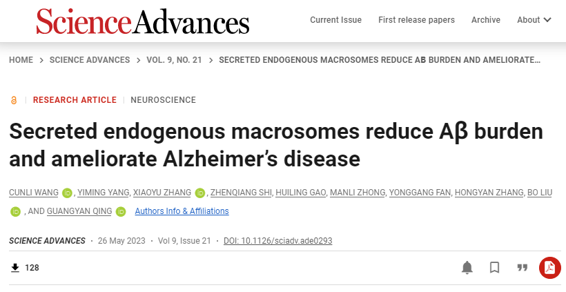 Recently, Professor Liu Bo from the School of Biomedical Engineering at Dalian University of Technology's Faculty of Medicine, in collaboration with senior researcher Qing Guangyan from the Dalian Institute of Chemical Physics of the Chinese Academy of Sciences, and Prof. Gao Huiling from Northeastern University, proposed a new perspective for treating Alzheimer's disease. Their findings, titled "Secreted endogenous macrosomes reduce Aβ burden and ameliorate Alzheimer’s disease," were published in the journal Science Advances (DOI: 10.1126/sciadv.ade0293).
