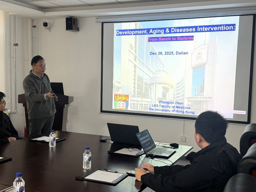 12月26日下午,医学部第13期“大工医学讲堂”在厚坤楼C204会议室顺利举办。本次活动特邀请香港大学医学院徐锦全分子医学明德教授周中军以“发育和衰老及相关疾病干预”为主题作前沿学术报告。医学部党委书记兼常务副部长覃开蓉、副部长魏健雄出席活动,学部相关领域师生代表共同参与交流。