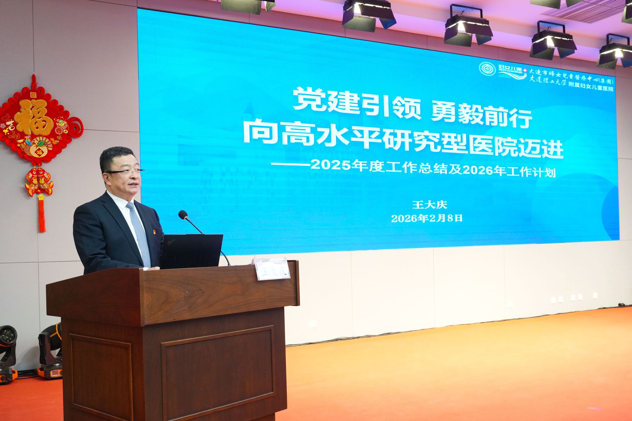 康旭东副校长首先代表学校向坚守临床一线的医务工作者致以最诚挚的问候和衷心的感谢。他表示,过去的一年,医院成为学校附属医院和第二临床学院,进一步增强了学校医学学科的力量。作为辽宁省儿童、妇产区域医疗中心,医院始终以民生服务为导向,持续提升疑难重症诊疗水平,为区域妇女儿童健康筑牢坚实屏障。他表示,学校将进一步深化与医院的战略合作,聚焦妇儿健康领域的重大需求,联合组建跨学科创新团队,攻克更多“卡脖子”技术难题;完善“ 医学+X”人才培养体系,推动医教融合、医工交叉向更深层次、更高水平发展,为打造东北医疗新高地、建设健康大连注入强劲动能!