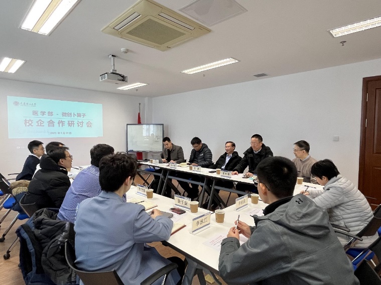 2023年2月20日下午,上海微创卜算子医疗科技有限公司总经理崔晨等一行5人到访大连理工大学医学部,双方于经管楼D263会议室召开校企合作交流研讨会。医学部部长曲鹏、党委书记兼常务副部长覃开蓉及相关专业领域的教师代表共14人参加会议,会议由医学部部长助理王洪凯主持。