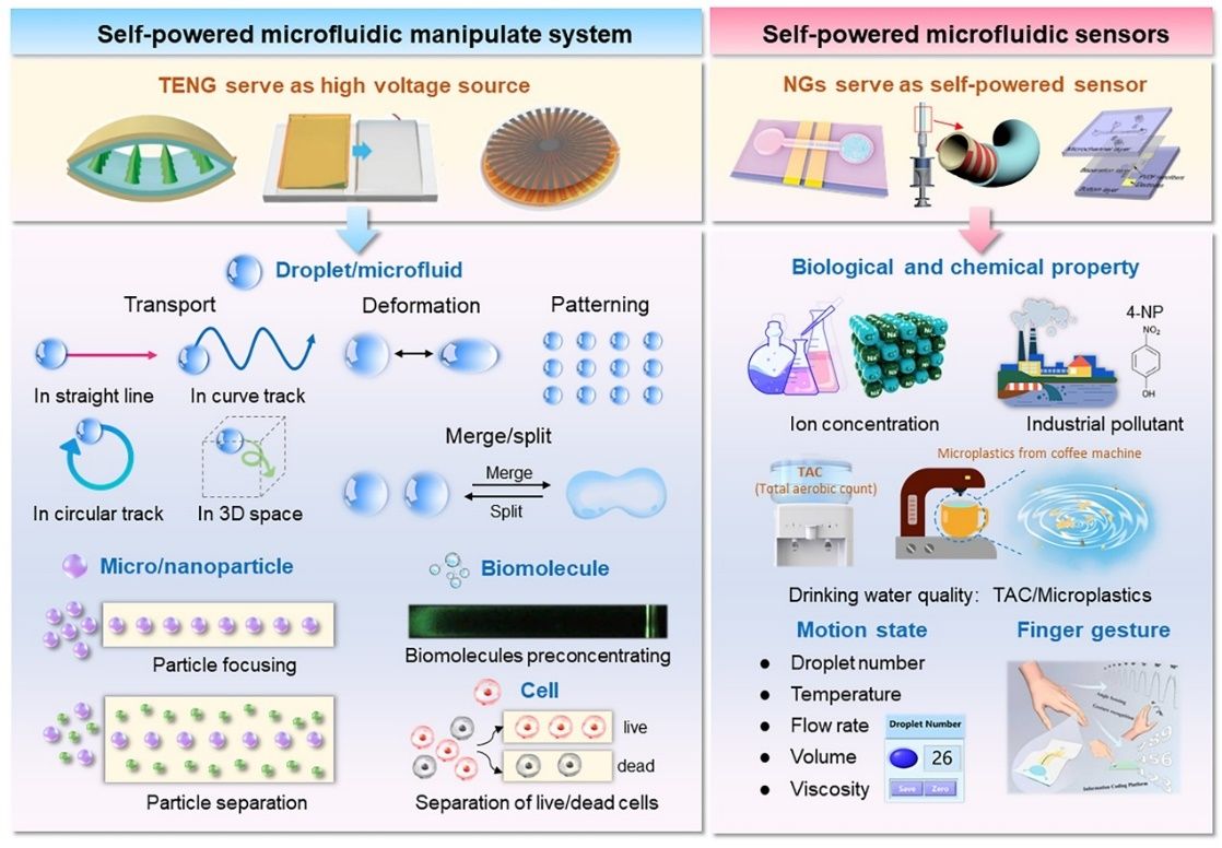 微流控(Microfluidics)指的是使用微管道处理或操纵微小流体的系统,该系统具有结构简单、样品消耗低的优点,且在过去的几十年里,微流控系统在生化检测、即时诊断检测、工业反应、药物输送和科学研究等不同领域得到了迅速发展。然而,微流控系统的正常运行离不开辅助设备的作用,这些辅助设备往往体积庞大,成本高,且需要外部供电。为了提高微流控系统的便携性并简化其结构,考虑到纳米发电机具有尺寸小、结构简单、成本低、环境友好等优点,研究人员将不同类型的纳米发电机与微流控芯片集成,开发出了具有多种独特功能的自供电微流控系统。