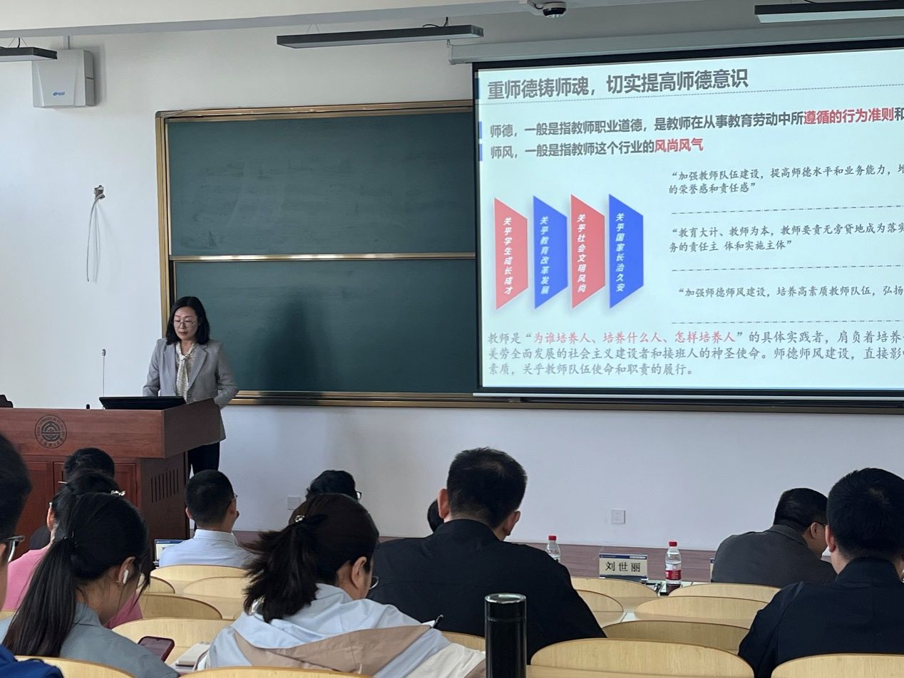 人力资源处副部长刘世丽在《加强师德师风建设 促进教师成长与师德养成》报告中从思想定位、法规文件、案例警示、工作要求四个方面强调:全体教师应重师德铸师魂,切实提高师德意识,明规矩守底线,准确把握职业规范,常反思存戒惧,自觉规范个人言行,落实主体责任,切实加强师德师风建设。