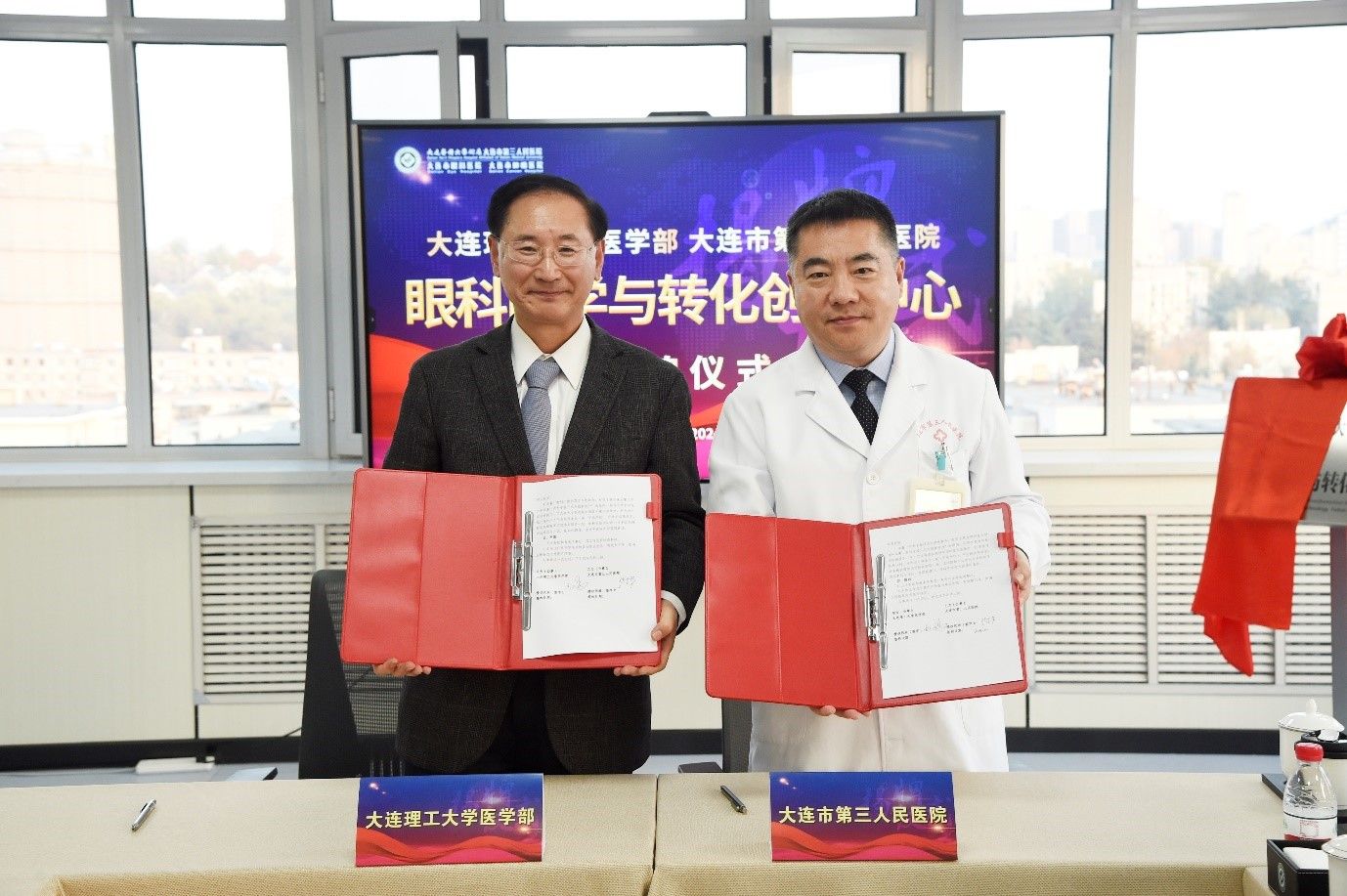 仪式上,曲鹏部长、张立军院长分别代表大连理工大学医学部和大连市第三人民医院签署了《大连理工大学医学部与大连市第三人民医院共建眼科医学与转化创新研究中心框架合作协议》。