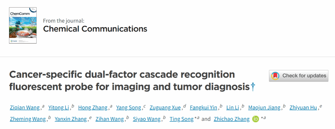 近日,大连理工大学医学部药学院张志超教授团队的论文“Cancer-specific dual-factor cascade recognition fluorescent probe for imaging and tumor diagnosis”在自然指数期刊《Chemical Communications》上发表,DOI: 10.1039/D4CC06634K。该研究首次制备出肿瘤标志物Bcl-2/GSH级联激活的turn-on型荧光探针,用于不同类型临床样本的癌症鉴别诊断,在精准医疗领域具有广阔的应用前景。