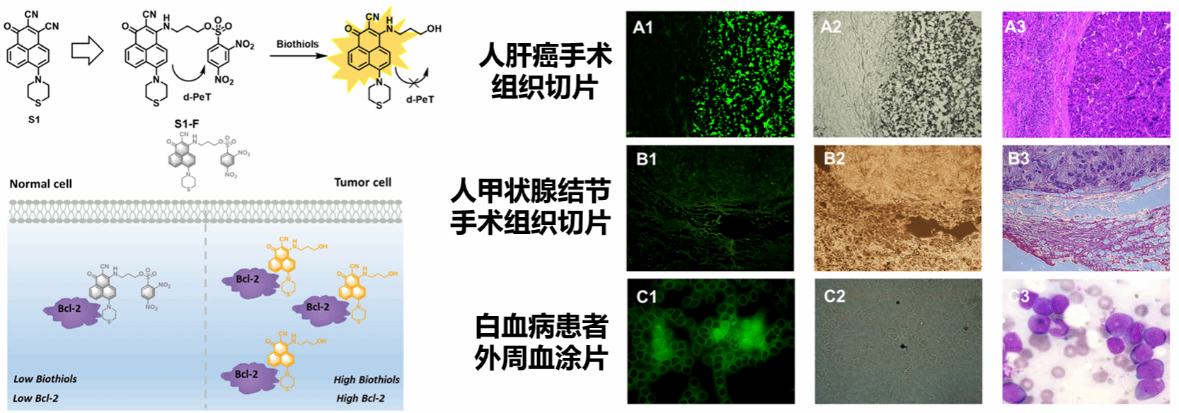 基于反应的turn-on型荧光探针是利用探针与分析物发生化学反应前后荧光发生变化,实现对分析物特异性识别的一类荧光探针,具有操作简单、高灵敏性、无创实时检测等优点,被广泛地应用于肿瘤早期诊断和辅助手术等领域。Bcl-2蛋白和谷胱甘肽(GSH)是多种肿瘤的潜在生物标志物。Bcl-2蛋白是细胞凋亡通路的关键节点蛋白,在多种人类癌细胞中高表达,帮助肿瘤细胞逃避凋亡;谷胱甘肽(GSH)在肿瘤微环境中高水平表达,增强肿瘤细胞抗氧化能力。基于此,张志超教授课题组集成本课题组前期研发的Bcl-2荧光抑制剂(ChemBioChem 2021, 22, 326-329)和GSH反应基团,构建了一种Bcl-2/GSH级联激活的荧光探针S1-F。设计的探针被Bcl-2富集于肿瘤细胞内部后,进一步被GSH反应触发“turn-on”荧光信号。该探针显著提高了肿瘤-正常组织荧光强度比率(T/N ratio),实现了对于人外周血样本、疑似癌症的结节和占位包块的手术切除样本的快速、可视化检测,仅需几分钟时间,就能通过荧光区分正常白细胞和白血病细胞,区分癌症包块和良性结节。是对现有的病理诊断方法的有效补充和升级。
