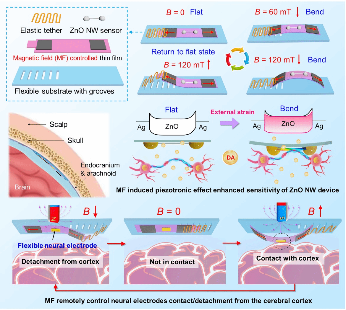 基于纳米材料的场效应晶体管(纳米FET)是关键的生物电子器件,用于检测生物分子信号、细胞相互作用和生物系统内的组织反应。这些纳米场效应晶体管的性能受金属电极和半导体纳米材料之间的界面特性的显著影响,需要精确的调控。虽然压电效应是一种常用的调节方法,但在某些应用场景下,特别是在体内环境下,它面临着局限性。本研究将压电纳米线场效应晶体管生物传感器的原理与磁性软机器人的灵活性相结合,设计了一种新型的磁控压电器件(MCPD)。通过磁场(MF)诱导的压电效应实现了对的金属-半导体界面特性进行远程、精确和稳定的调控。进而提高了其检测生物分子(如多巴胺)和记录神经电脉冲的灵敏度。在施加不同强度和方向的MF时,MCPD表现出在平面和弯曲状态之间的可逆转变,磁场加载时间仅持续几秒钟。此外,MCPD的独特结构使得半侵入性神经电极可以仅在需要时与大脑皮层接触,从而提高生物相容性,降低侵入性。该研究为压电器件的远程磁驱动调控提供了一种可行的策略,提高了植入生物电子神经器件的灵敏度和生物相容性,并在体内诊断和治疗应用中具有很大的潜力。