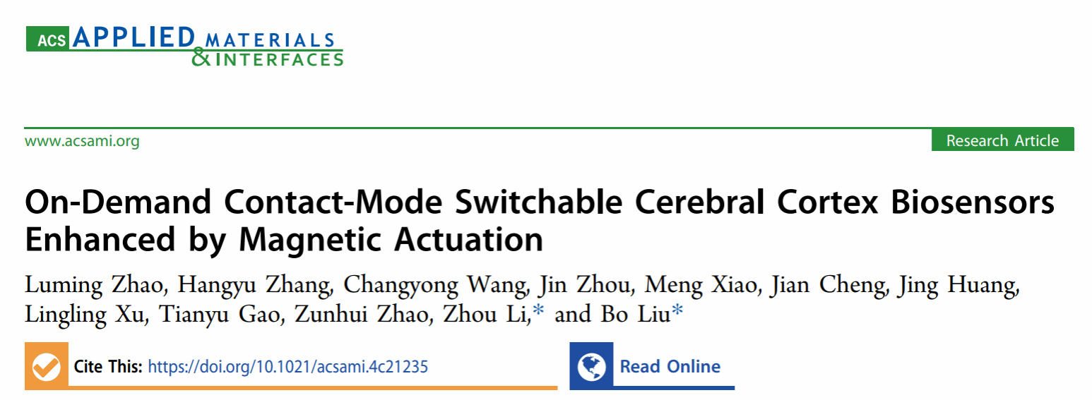 近日,大连理工大学医学部刘波教授团队的论文“On-Demand Contact-Mode Switchable Cerebral Cortex Biosensors Enhanced by Magnetic Actuation” 在材料科学领域的国际权威期刊《ACS Applied Materials & Interfaces》上发表。医学部生物医学工程学院赵璐明助理教授为本文的第一作者,刘波教授和中科院北京纳米能源与系统研究所的李舟教授为通讯作者。