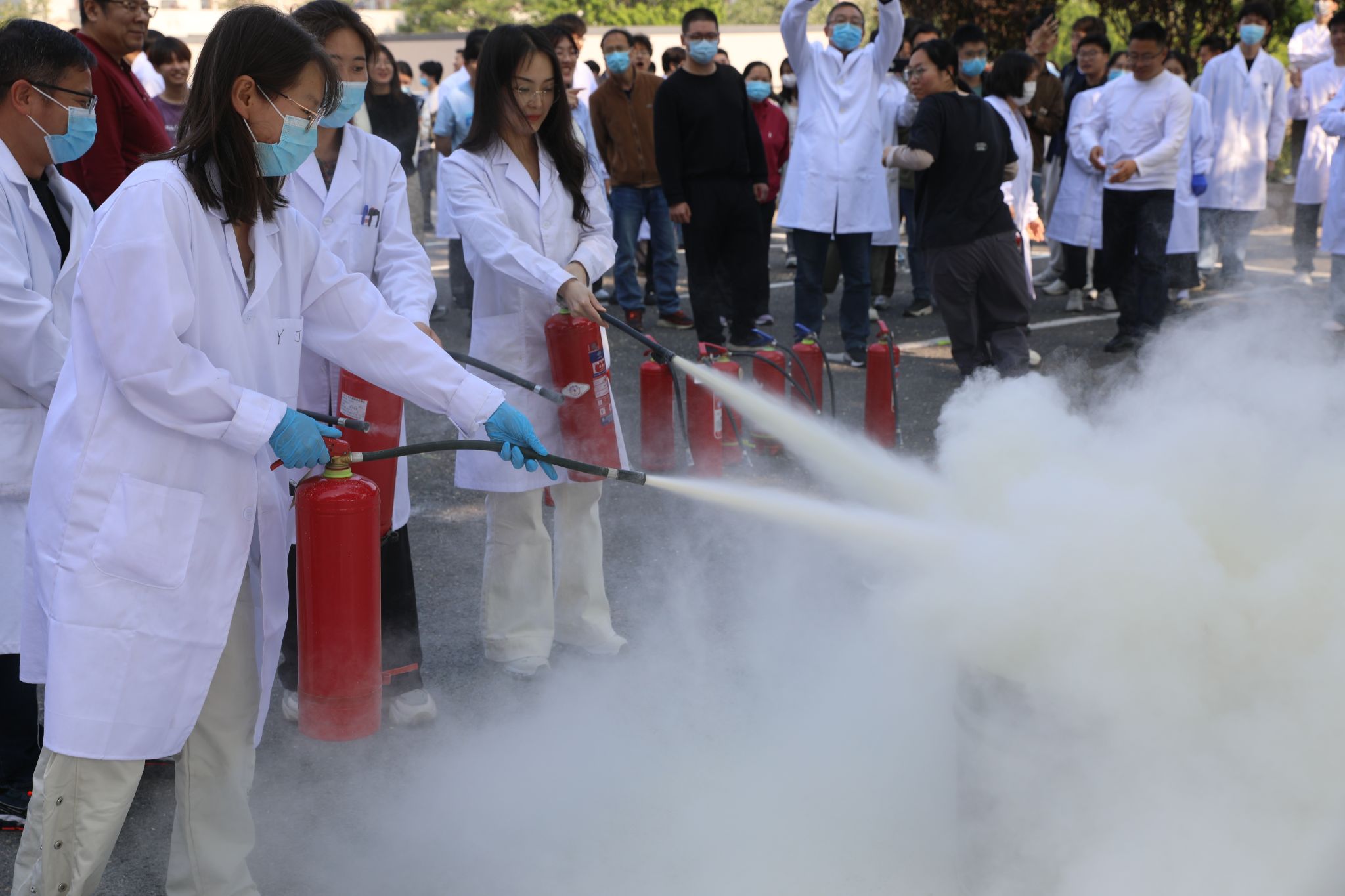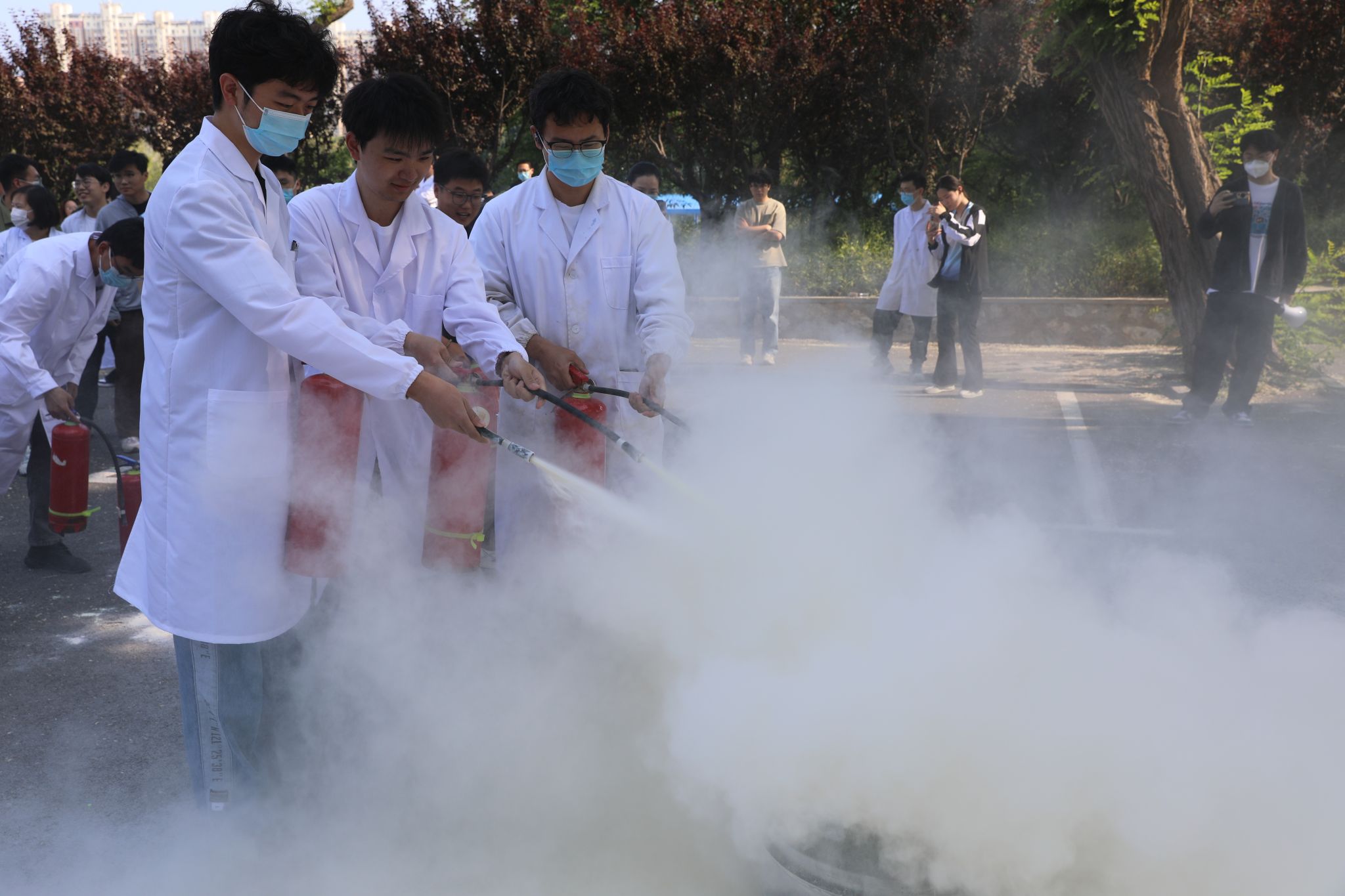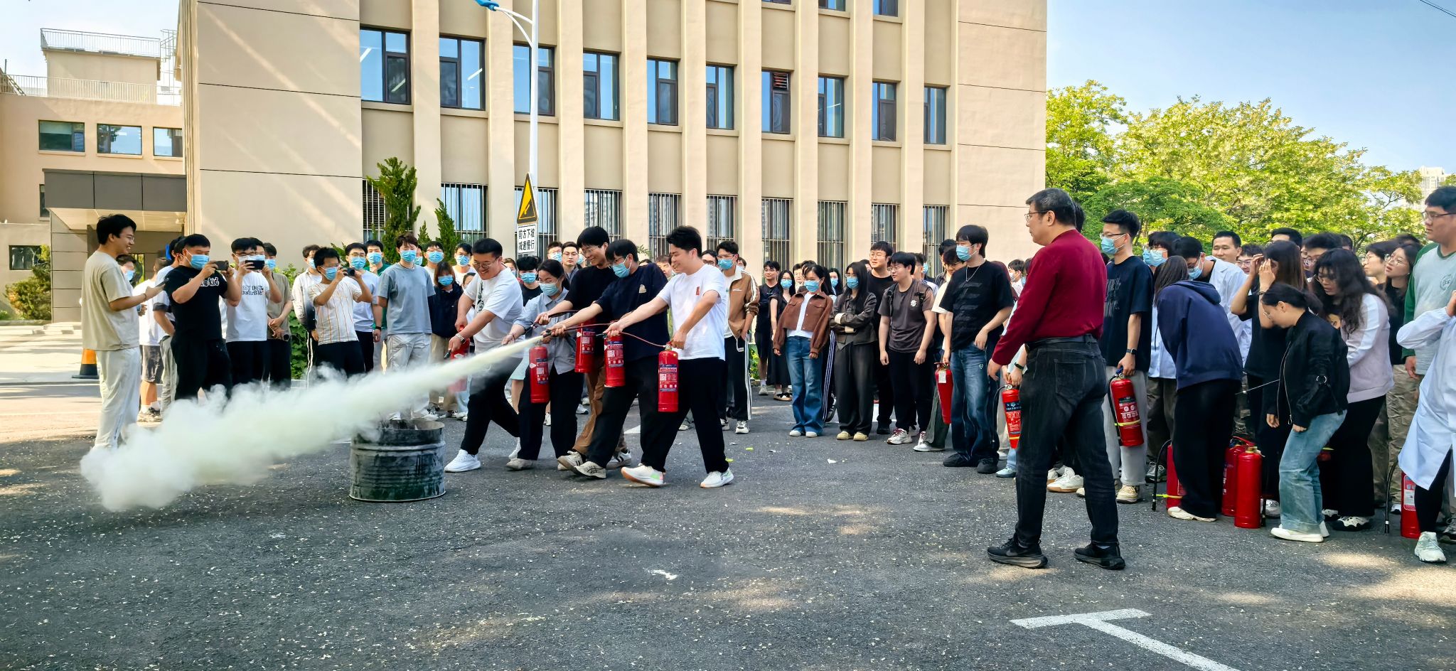 实操培训阶段,葛老师在楼前空地上详细演示灭火器使用方法。他将操作流程总结为"提、拔、握、压"四字口诀,指导师生进行灭火演练。参训师生在专业指导下成功扑灭模拟火源,切实掌握了扑灭初期火灾的技能。