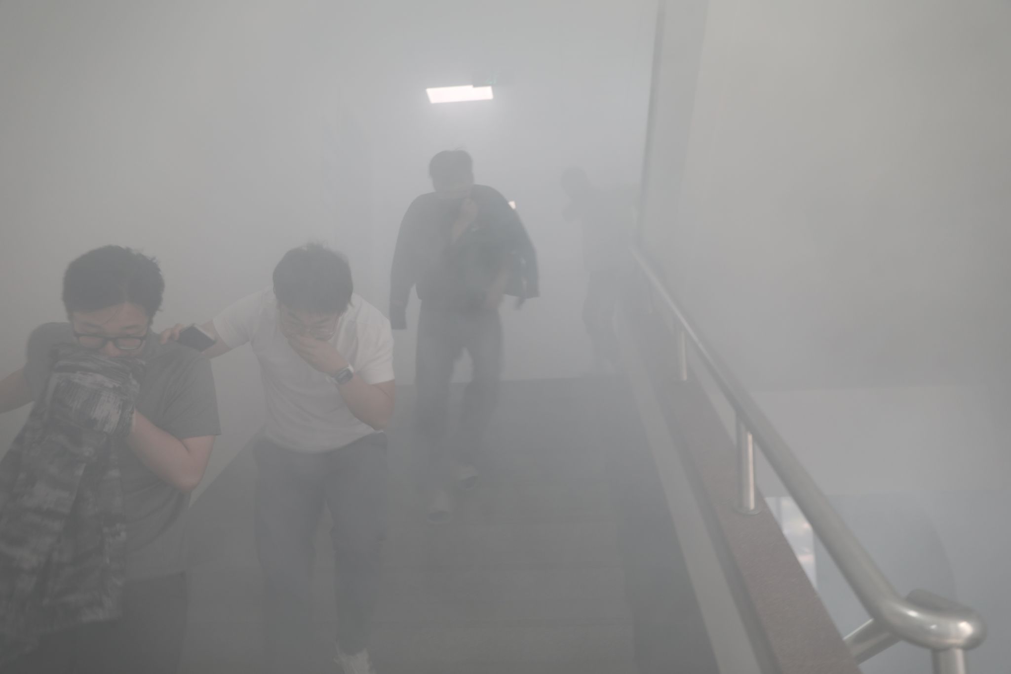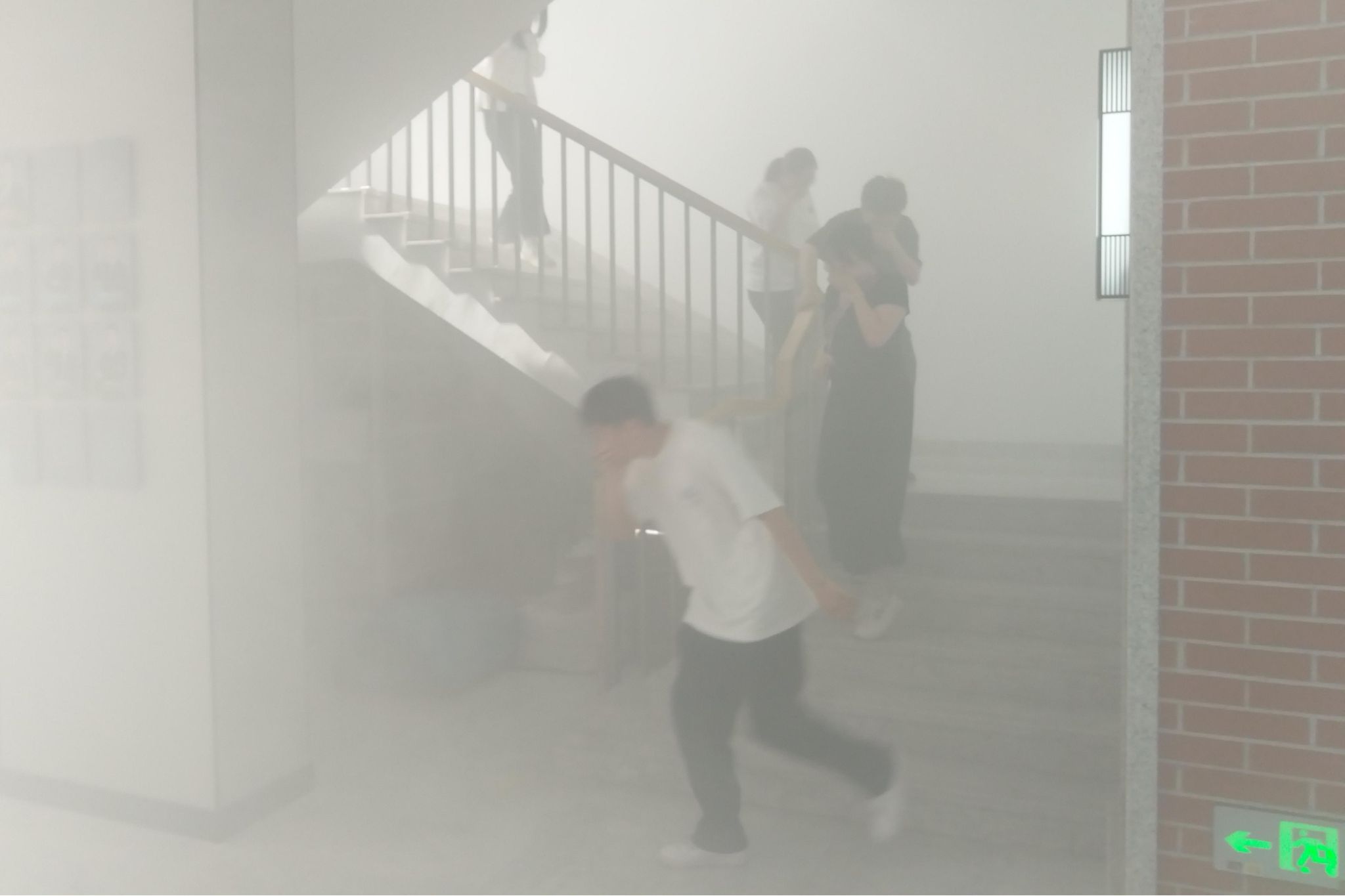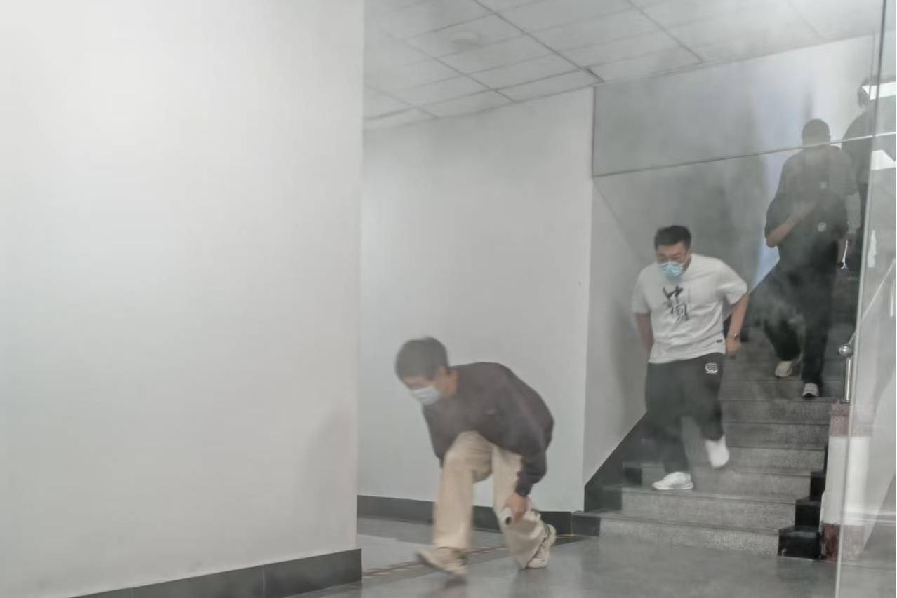 在模拟火灾疏散演练环节,随着警报声响起,全体楼宇人员迅速启动应急响应。在安全员的引导下,师生们迅速捂住口鼻,弯腰沿安全通道有序撤离。从警报响起到全员疏散至指定集合点,全程仅用时30秒,展现出高效的应急反应能力。
