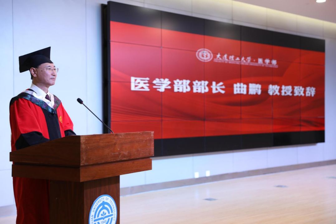 典礼最后,由医学部部长曲鹏教授发表致辞。他代表全体教师向顺利毕业的同学们表示热烈祝贺,并寄语大家铭记医者初心,怀揣远大理想,让青春在强国建设、民族复兴中挺膺担当。