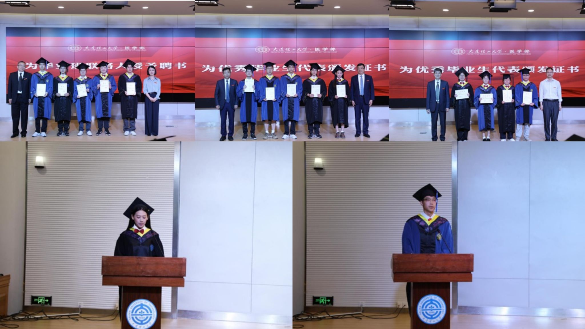 医学部部长助理朱勇教授与校医院院长郭力鹏主任为新一届毕业班联络人颁发聘书,鼓励他们将校友情谊薪火相传。附属中心医院院长袁宏、附属妇女儿童医院院长王大庆共同为辽宁省优秀毕业生代表颁发荣誉证书。附属第三人民医院党委书记卢成华书记与医学部部长助理唐洪为大连市及校级优秀毕业生代表颁奖,表彰他们在学术和综合素质等方面的杰出表现。
