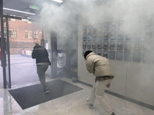 理论培训结束后,模拟火灾疏散演练随即启动。随着模拟烟雾释放,应急响应机制迅速启动,现场安全员立即到位引导,参训师生迅速反应,沿预定安全通道快速向指定集合点疏散。整个疏散过程紧张有序、衔接顺畅,从模拟烟雾释放至全员集结完毕,仅用时30秒,充分展现了师生过硬的应急反应能力和良好的安全素养。