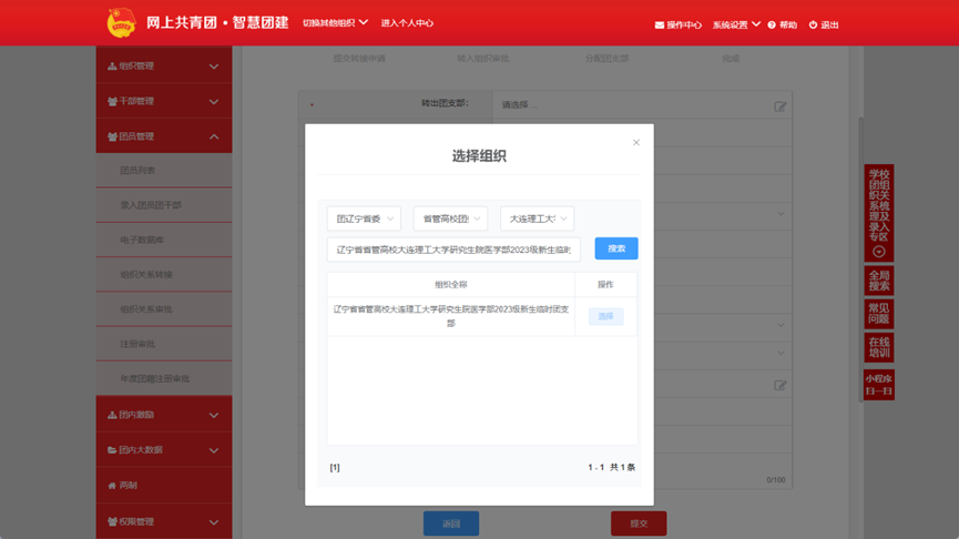 选择组织:团辽宁省委-省管高校团委-大连理工大学团委-辽宁省省管高校大连理工大学研究生院医学部2023级新生临时团支部。