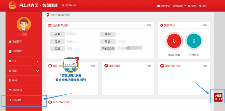 1.在电脑端登录本人的智慧团建账号(https://zhtj.youth.cn/zhtj/)。也可在微信中扫以下二维码/搜索“团中央智慧团建云平台”小程序进行登录操作。