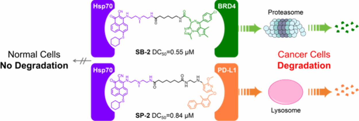 (2)基于HSP70的“双通路”肿瘤特异性蛋白靶向降解嵌合体(HSP70TAC)系统,实现单平台对胞内外蛋白的全域降解覆盖。通过将HSP70抑制剂与靶蛋白配体偶联,在一个小分子平台中整合了泛素-蛋白酶体(胞内)和内吞-溶酶体(胞外)双通路,分别降解胞内BRD4与膜蛋白PD-L1,打破了PROTAC在蛋白定位上的“区室化”限制。由于HSP70在肿瘤细胞中丰度高,且HSP70TAC对HSP70亲和力适中(KD ≈ 5 μM),避免了高浓度下三元复合物解离导致的“钩状效应”,保持高效降解。同样,利用Hsp70在肿瘤细胞中高表达的特征,Hsp70TAC也能够实现对靶蛋白的肿瘤特异性降解,降低正常细胞毒性。论文链接:https://pubs.acs.org/doi/10.1021/acs.jmedchem.5c03784