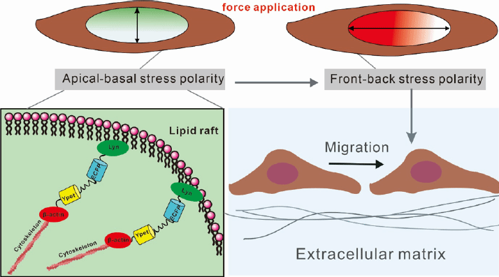 肿瘤转移占癌症致死的90%以上,有效抑制肿瘤转移就能极大程度提高癌症病人的存活率。在另一篇论文中,团队基于荧光蛋白的荧光共振能量转移(FRET)技术研发了一种检测活细胞内应力分布的探针MaSS,实现了细胞膜与细胞骨架之间应力状态的可视化检测(图2)。通过该探针,团队发现肿瘤细胞上下表面之间的固有应力存在明显的差异,通过药物干扰破坏这种差异后,肿瘤细胞的迁移能力消失。说明这种应力极性差异可能是肿瘤细胞发生迁移的前提,这一发现为抑制肿瘤转移提供了新的治疗策略,也为肿瘤研究提供了有力的科研工具。(论文链接https://doi.org/10.1021/acssensors.4c00628)