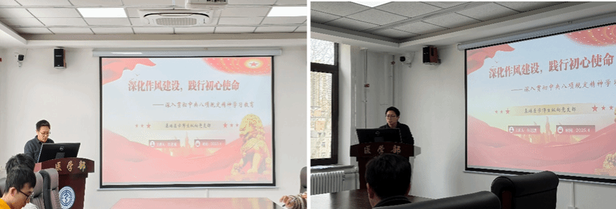 为深入学习贯彻习近平总书记关于加强党的作风建设的重要论述,认真学习贯彻中央八项规定及其实施细则精神,筑牢师生党员纪律规矩意识,4月18日,医学部基础医学师生纵向党支部开展“深化作风建设,践行初心使命”主题党日,深入学习中央八项规定精神及相关典型案例。会议由党支部书记朱进波主持,全体党员及部分入党积极分子参加。
