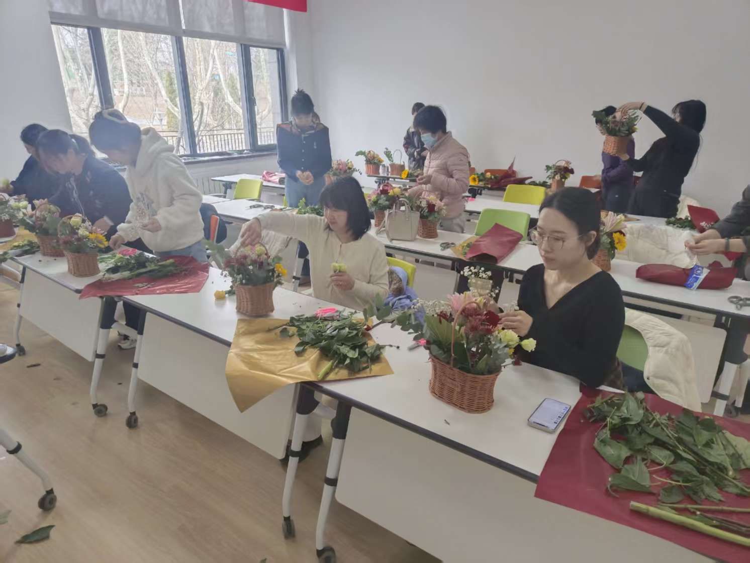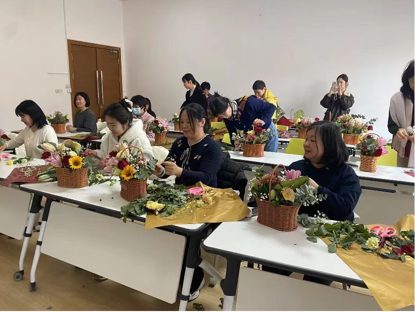 在实践操作过程中,女教职工们充分发挥自己的创意和想象力,将原本零散的花枝、绿叶进行精心搭配和修剪。大家相互交流、互相借鉴,现场欢声笑语不断。经过一番精心创作,一篮篮风格各异、精美绝伦的花艺作品呈现在眼前,每一件都蕴含着创作者对美的独特理解和对生活的热爱。有的作品色彩鲜艳、热烈奔放,展现出女性的活力与激情;有的作品简约淡雅、清新脱俗,体现了女性的温婉与细腻。