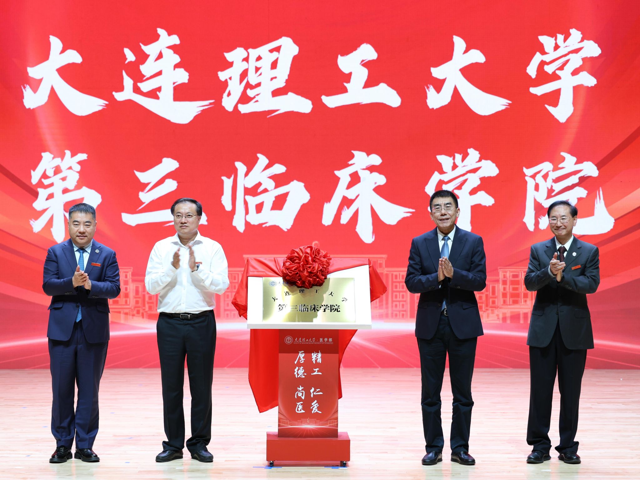 典礼在雄壮的国歌声中正式开幕。本次典礼同时也是我校四所临床学院的揭牌仪式。校党委常务副书记宋丹、大连市卫生健康委员会党组书记、主任王聚共同完成大连理工大学临床肿瘤学院、大连理工大学第一临床学院、大连理工大学第二临床学院、大连理工大学第三临床学院的揭牌。此举标志着“大学-医学部-临床学院”三级管理体系全面确立,将为医学人才培养提供更为坚实和规范的医教研支撑。