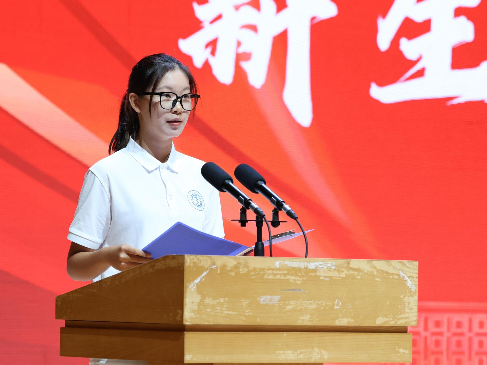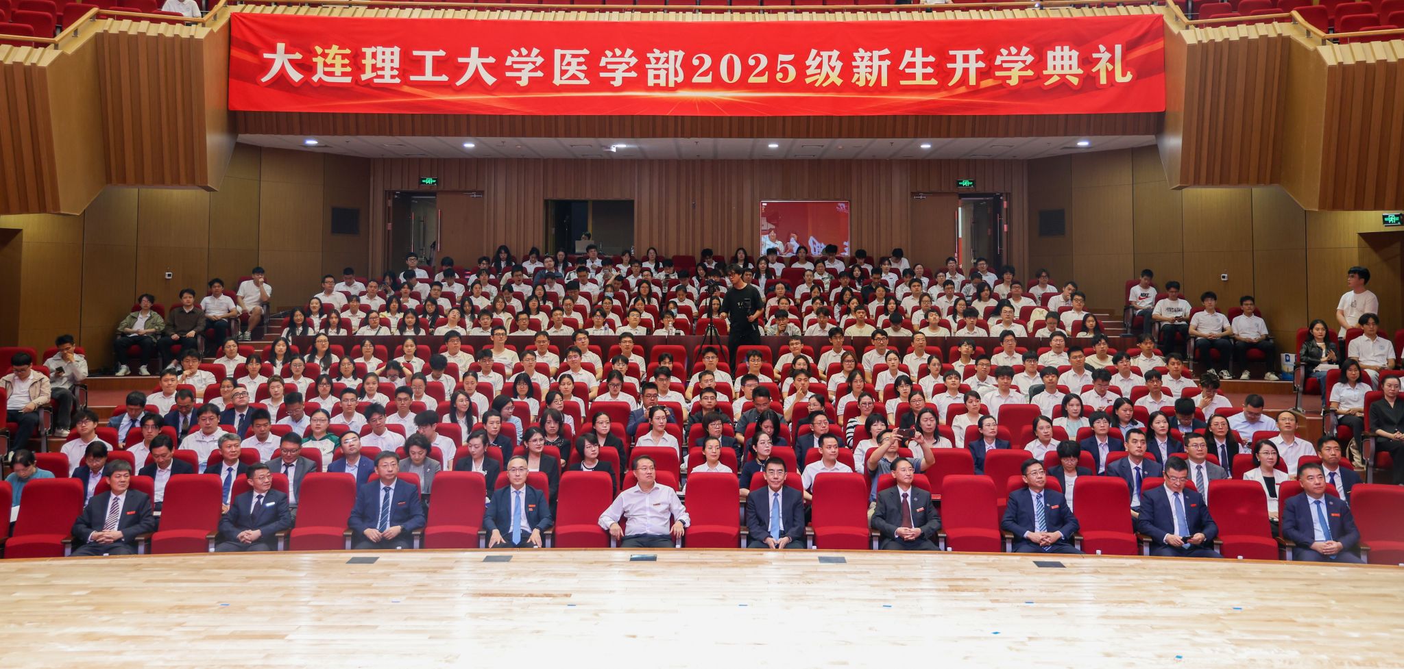 授袍仪式与医学生誓言环节庄严肃穆。在大连理工大学附属中心医院裴作为的带领下,全体新生高举右拳,许下了献身医学事业、守护人民健康的郑重承诺。典礼尾声,与会嘉宾为新生代表佩戴校徽与部徽,全场齐声高唱校歌。开学典礼在激昂奋进的氛围中圆满落幕。