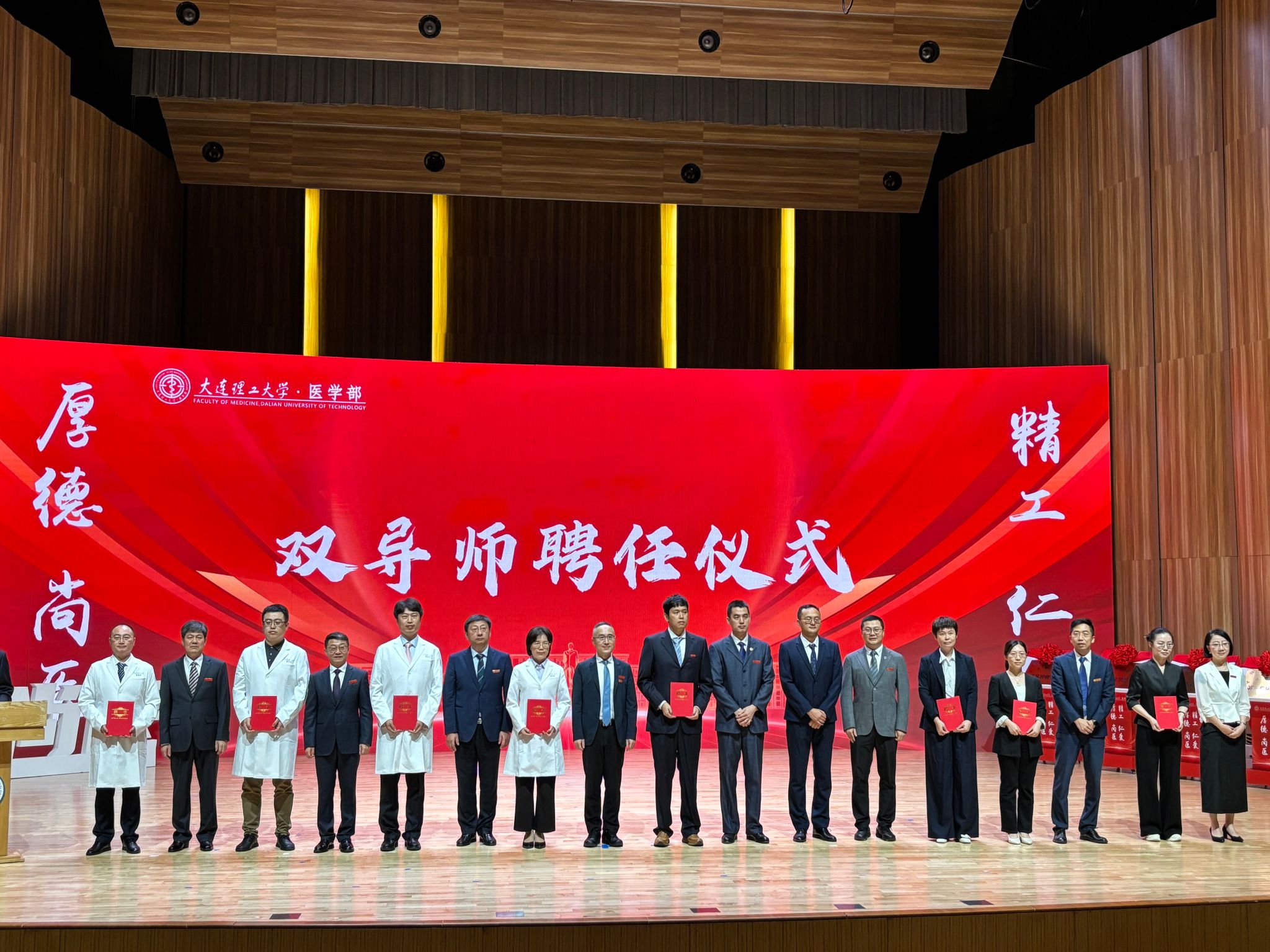 在之后举行的双导师聘任仪式上,学部与附属医院共同为每一名新生选聘了临床导师与科研导师。医学部和大连理工大学附属医院的班子成员为导师们颁发证书。双导师制度旨在促进学生“临床能力与科研素养双提升”,构筑精准育人的创新模式。