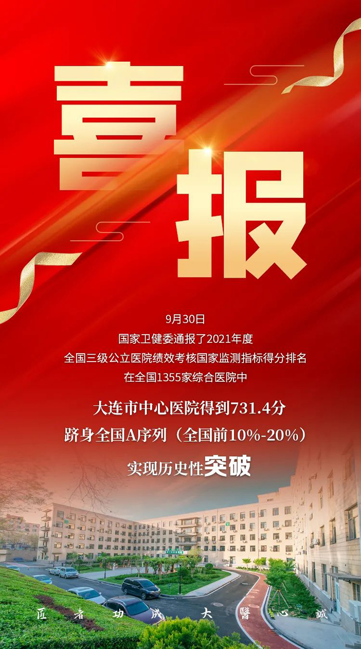 国庆前夕,2021年度全国三级公立医院绩效考核“国考”正式放榜,大连市中心医院以总分731.4分的成绩在全国1355家综合医院排名第227位,较2020年度考核名次提升了280名,以突出业绩进入全国综合医院A级方阵,创医院历年“国考”最好成绩!